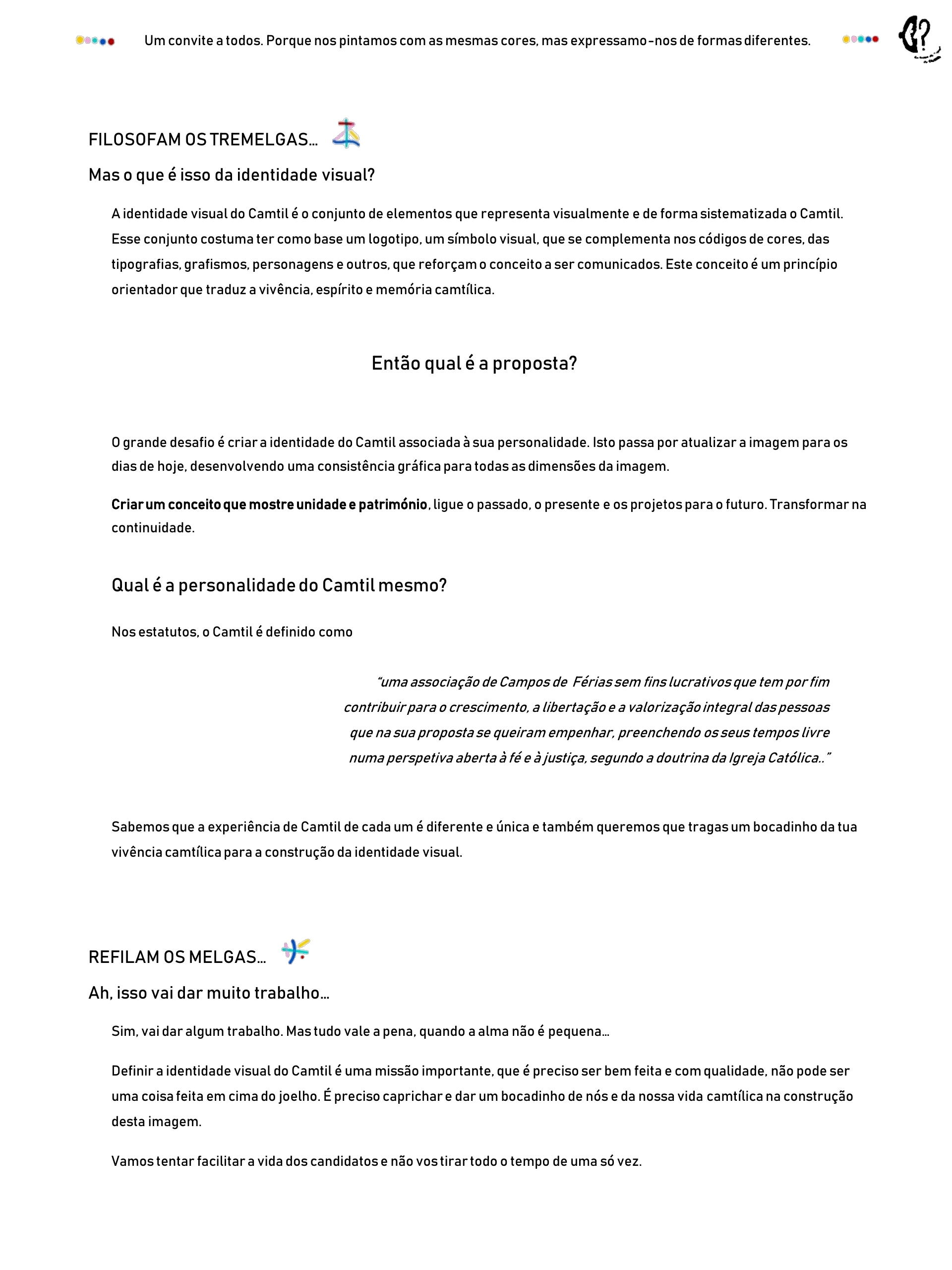 Uma alegria para todas as idades. Que contagia e transforma as famílias e o mundo à nossa volta. Desde as histórias infindáveis que Mosquitos e Aranhiços contam meses a fio, dos encontros e re-encontros de Melgas e Tremelgas para matar saudades, do sonho do Camaleão que quer agora ser "animador para a Vida", das mãos e do coração dos Trolhas que por onde passam deixam marcas visíveis do espírito de serviço.... E os Cegonhas? Mães e Pais do Camtil que também se deixam transformar por tudo isto, não apenas para compreender melhor o que os pequenos da casa contam mas sobretudo para serem melhores... na família e na construção do Reino.